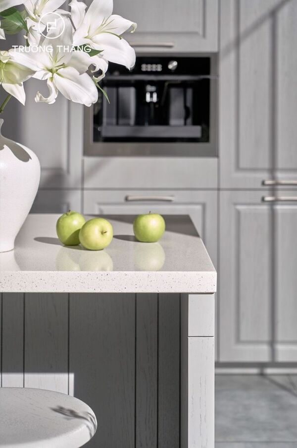 Trường Thắng ứng dụng đá thạch anh nhân tạo (quartz) Vicostone cho dòng sản phẩm Tủ bếp. Với cốt liệu 90% đá thạch anh tự nhiên, được liên kết bởi keo resin và rung ép trong môi trường chân không. Đá quartz Vicostone gần như đặc chắc tuyệt đối, mang nhiều ưu điểm.