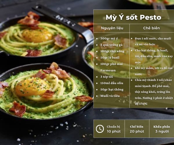 Vớt mỳ Ý đang ngâm ra và để ráo nước. Sau đó chia 3 phần vào nồi/chảo gang mini STAUB, cho nước sốt Pesto lên trên trộn đều. Điều chỉnh mùi vị bằng chén nước luộc mỳ để lại ban nãy. Thêm phô mai Parmesan, thịt xông khói và trứng lên trên, sau đó cho vào lò nướng. Nướng ở nhiệt độ 170 độ C trong vòng 2 phút. Sau đó mang ra và thưởng thức!