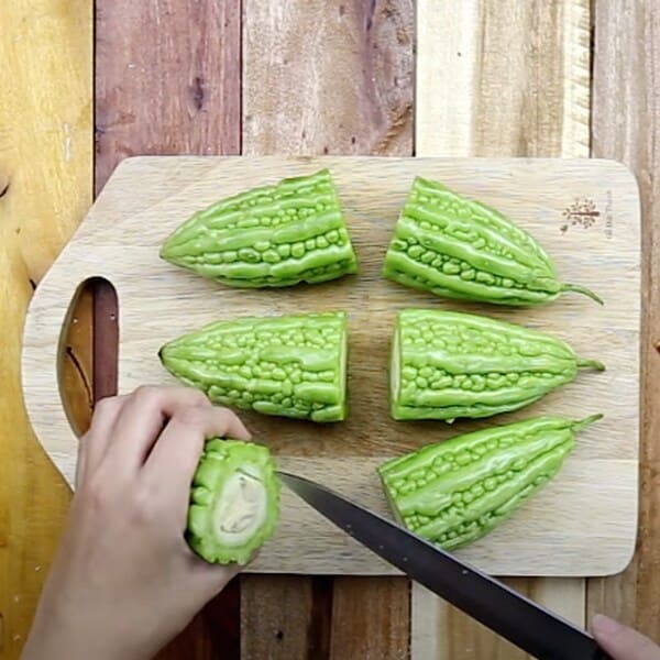 Cắt hai đầu khổ qua, rạch một dường dài trên thân, dùng dao tách nhẹ đường rạch ra, sau đó thu thập muỗng cà phê nạo bỏ hết phần hạt và ruột quả. Ngâm khổ qua với nước muối pha loãng vào khoảng thời gian 10 – 15 phút. Xả lại với nước sạch và để ráo. Việc ngâm khổ qua với nước muối sẽ giúp hạn chế vị đắng của khổ qua.