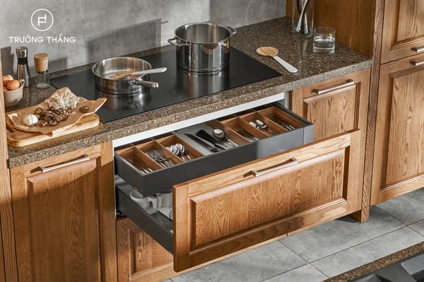 Khu lưu trữ vật dụng dành cho mọi thứ khác còn lại trong nhà bếp. Khu vực này không nên chiếm vị trí đắc địa trong bếp của bạn. Đây thường là nơi lưu trữ các đồ dùng như đĩa, bát, cốc và dụng cụ ăn uống. Vì vậy, nó nên được đặt gần khu dọn dẹp để bạn có thể dễ dàng cất chúng sau khi rửa và làm khô. Đây cũng là nơi lý tưởng để cất giữ những thiết bị nhỏ không dùng đến hàng ngày.