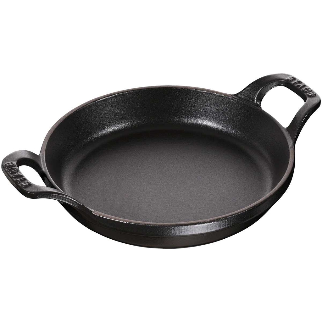 Thiết kế hình tròn hiện đại với hai kích thước linh hoạt 16cm và 20cm, phù hợp cho nhiều món ăn từ nướng bánh tới áp chảo. Ngoài ra, kiểu dáng sang trọng giúp khay có thể được sử dụng để trình bày món ăn trực tiếp trên bàn tiệc, tăng phần hấp dẫn cho bữa ăn gia đình. Toàn bộ bề mặt từ lòng khay đến đáy đều được STAUB tráng qua các lớp men đen, giúp khay có độ bóng loáng, hạn chế sự bong tróc, vệ sinh dễ dàng hơn.
