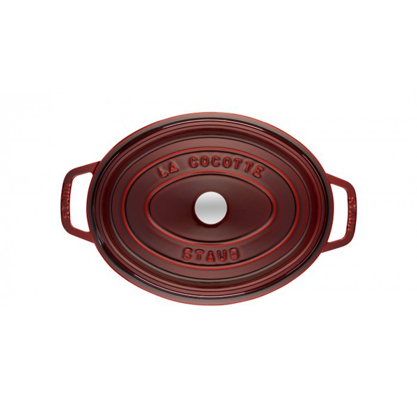 Nồi gang hình oval màu lựu đỏ là sản phẩm của thương hiệu STAUB đến từ Pháp.