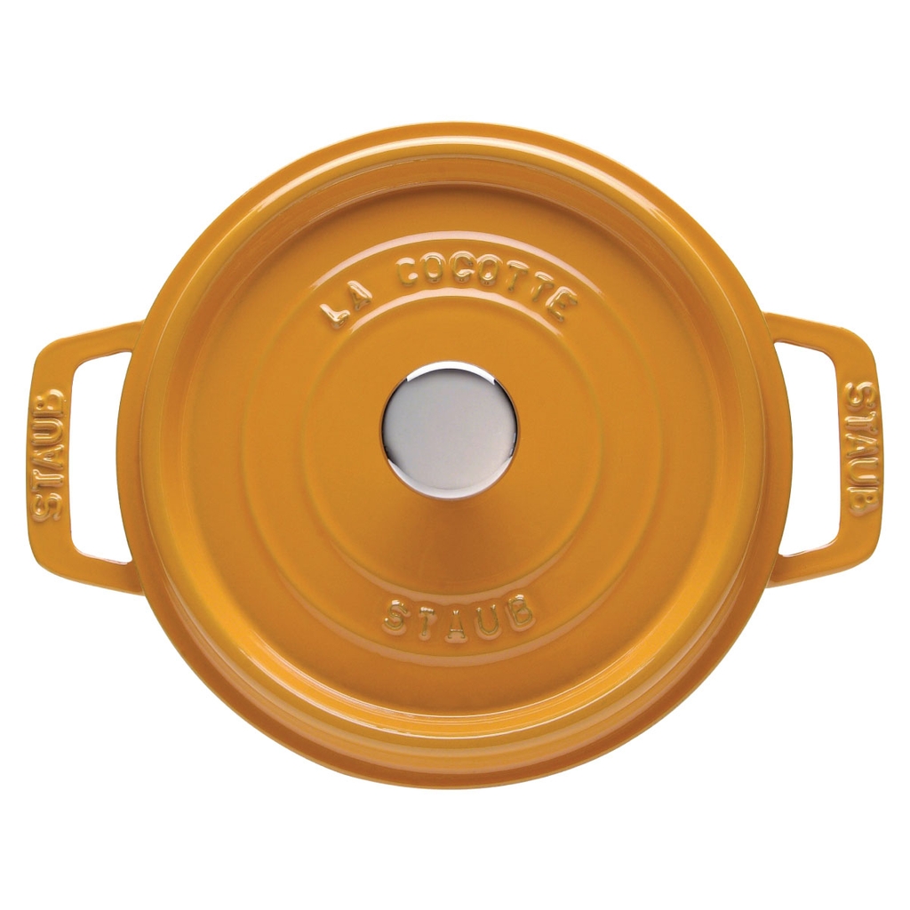 Nồi gang tròn màu vàng là sản phẩm của thương hiệu STAUB đến từ Pháp.