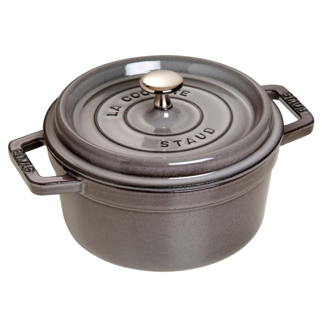 Nồi gang tròn màu xám là sản phẩm của thương hiệu STAUB đến từ Pháp.