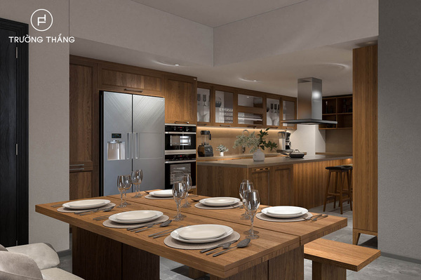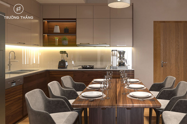 Thiết kế nội thất bếp chung cư kèm bàn ăn sẽ giúp chủ nhà dễ dàng hơn khi tiếp khách. Bạn có thể nấu ăn và khách đến chơi nhà cũng có thể giúp chuẩn bị bày biện bàn ăn.